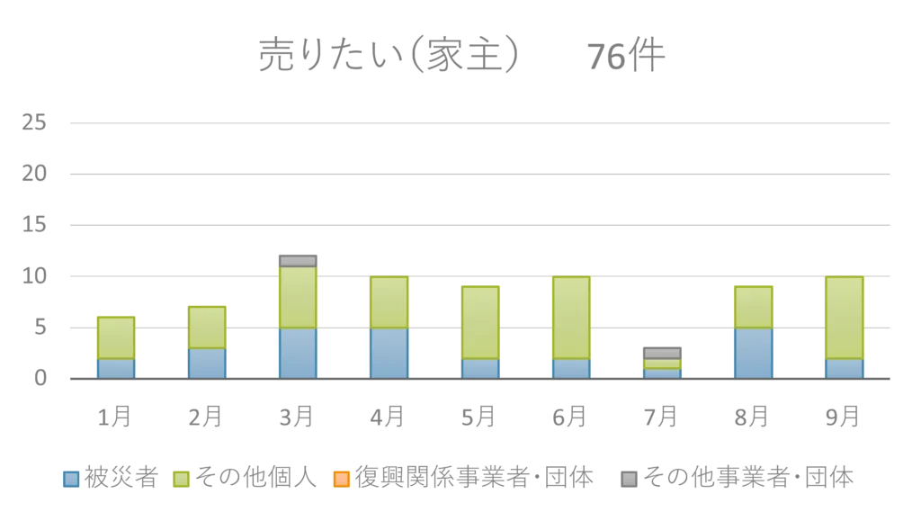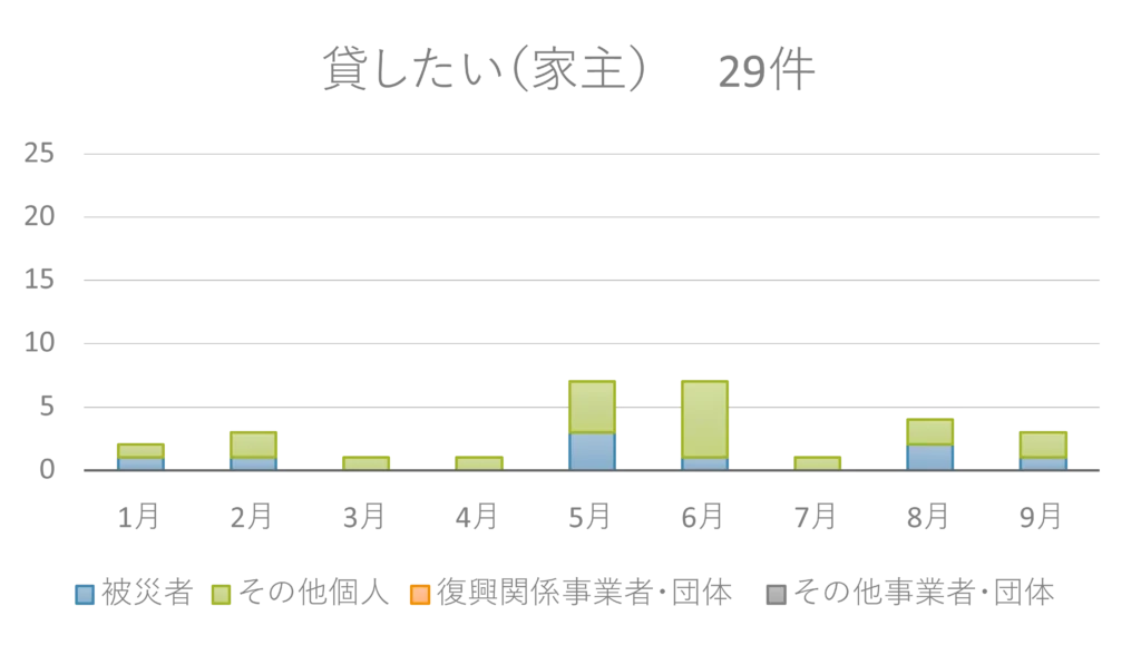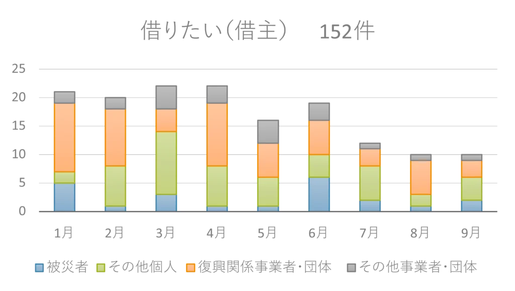 「借りたい」という相談が最も多くなっています。 内訳を見ると、復興工事関係者や支援団体、および被災地域外からの移住希望者(その他個人)が大部分を占めているのが特徴です。復興事業の本格化に伴う活動拠点の確保や、地域外からの新たな人の流入が賃貸需要を牽引していることが見て取れます。