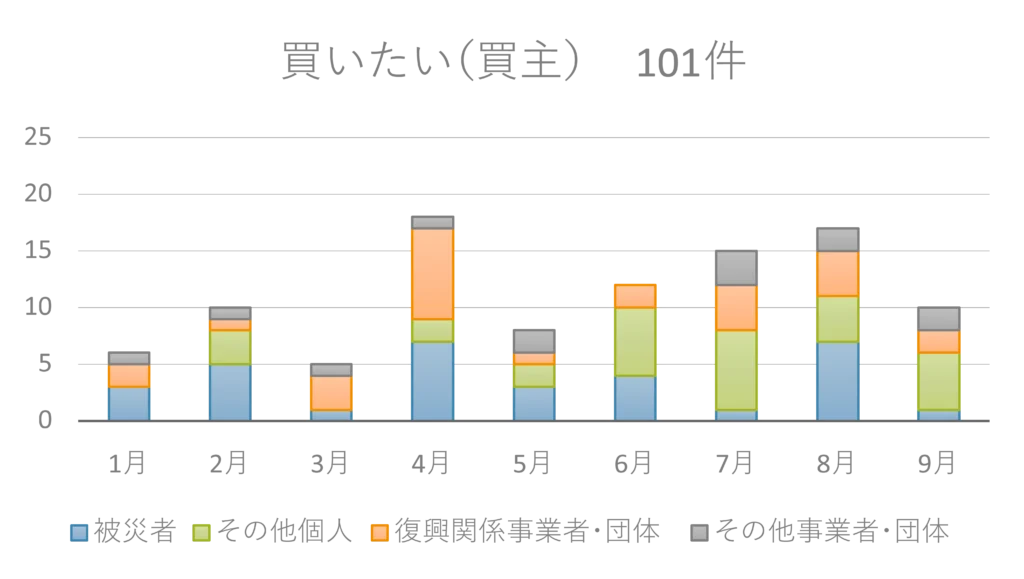 「買いたい」というニーズにおいては、事業者からの相談が限定的である一方、被災者自身からの相談が一定の割合を占めています。 これは、仮住まいとしての「賃貸」ではなく、「持ち家」での生活再建を望む層が根強く存在していることを示しています。もともと賃貸物件に居住していた方が住み替えることができる賃貸物件が少ないことも影響しています。