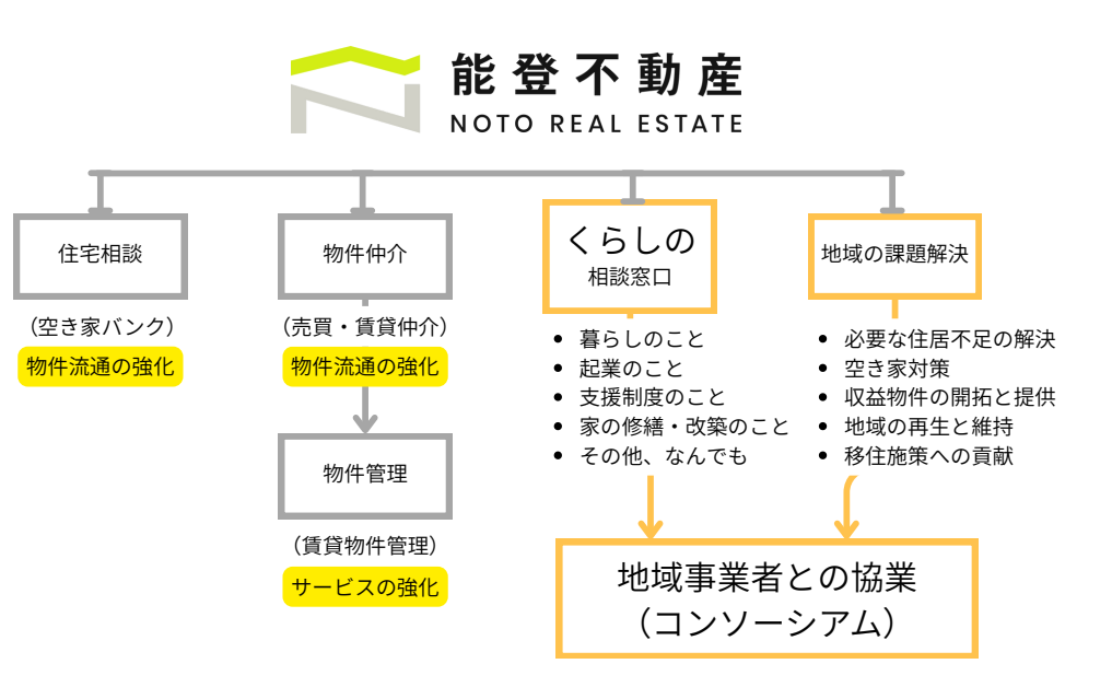 今回実施した「奥能登不動産に伴走する居住支援事業」では、奥能登で数少ない専業の不動産事業者として活動する「能登不動産株式会社」を対象に、以下の取り組みが行えるよう仕組みづくりを提案し、伴走支援を実施しました。